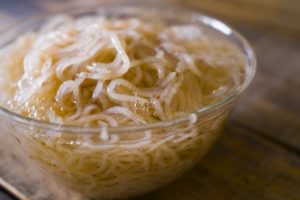 ②2等分にした春雨をお湯で5分茹で、水気を切っておく。