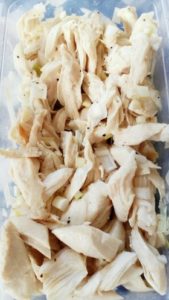 ささみをレンジで加熱し、粗熱をとったら細かく割いておきます。