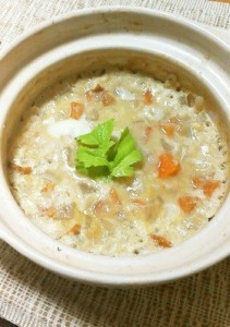 お餅、にんじん、大根を1㎝角に切り、おでんの煮汁(150cc)とともにお餅以外を入れて鍋にかけ、さらに、カットした玉ねぎとちくわ、ご飯(少量)、すりおろしたしょうがを加えて煮ます。