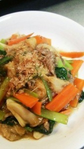 フライパンにオリーブオイルを入れ、お肉(豚肉でも牛肉でも)と野菜を入れて炒めたら、さらにお麩も加えて炒め、しょうゆ、だし汁、めんつゆ、お酒を入れて水気がなくなるまで炒めたら完成です。