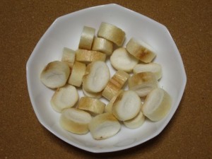 2㎝幅に切った車麩を水で戻し、水気を絞ったら半分に切ります。
