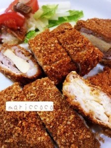 豚肉の薄切りを2枚重ねた上に、高野豆腐もしくは車麩を乗せ、さらに豚肉を2枚乗せて形を作り、塩コショウしたら、卵と小麦粉を混ぜたものにつけ、さらに炒ったパン粉をつけてオーブンシートを敷いた天板に乗せて、200度で20分焼いて完成です。