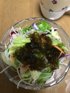 サラダにもずく酢をかけて完成です。