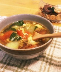 トマト、青梗菜、長ねぎをカットし、鍋に中華スープの素と水、醤油を入れて沸かしたところに、カットした野菜ともずく酢を加えて煮立たせ、さらに溶き卵を入れたらすぐに火を止めて、ごま油と一味唐辛子で作った自家製ラー油を加えて完成です。