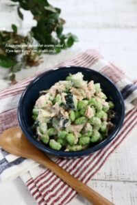 茹でて鞘から取り出し冷ましておいた枝豆と、1㎝角に切ったきゅうり、ツナ缶、調味料を入れて混ぜ合わせたら完成です。