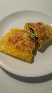 卵の真ん中に酢キャベツと納豆とかつお節(半分)を混ぜたものを置いて、卵で包みます。