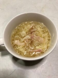 マグカップに酢キャベツ、適当にカットしたベーコン、酢キャベツが浸るくらいの水、コンソメを入れてふんわりとラップをし、電子レンジ600wで2分加熱します。
