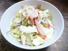酢キャベツ、千切りしたにんじん、ごぼう、きゅうり、割いたカニカマ、マヨネーズを和えたら完成です。