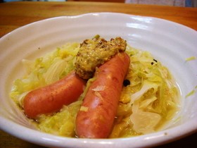 ウィンナーとバターを入れてさらに煮込み、味をみて少し塩辛ければ水を足し、すっぱかったら砂糖を足します。