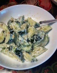 水切りしたヨーグルトとオリーブオイル、フェンネルシード、にんにく、塩コショウを混ぜてソースを作り、きゅうりと和えて完成です。