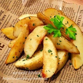フライパンに油(オリーブオイルがお勧め)をしき、じゃがいもを入れて塩を振って両面を焼きます。火を止めたらバターと塩少量、ガーリックパウダーを絡ませて完成です。