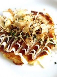 皮を剥いてすりおろしたじゃがいも、溶き卵をボールで混ぜ、焼く前にボール一杯分の生地と一掴みのキャベツを混ぜてフライパンで焼きます。両面が焼けたら、ソース、マヨネーズ、青のり、かつお節をかけて完成です。