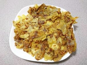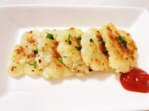 • じゃがいもを潰し、片栗粉とハーブソルトを混ぜて薄く丸く成形し、フライパンにオリーブオイルを入れて焼きます。