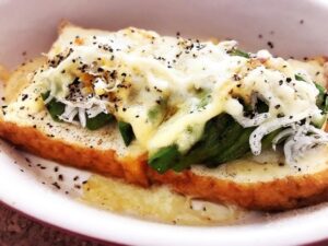 厚揚げをくり抜き、くり抜いた中に卵、ベーコン、チーズ、マヨネーズをかけてトースターで焼くだけ。
