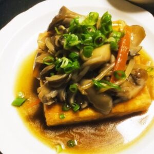 厚揚げの上にきのこを乗せ、きざみねぎをトッピングしたら完成です。