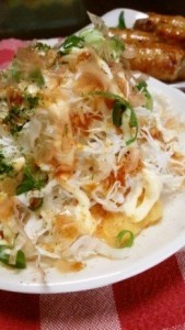 その上に千切りにしたキャベツと小口切りしたねぎをトッピングし、マヨネーズ、ソース、紅ショウガ、鰹節、青のりを掛けたら完成です。