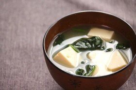 鍋にだし汁、カットした豆腐、ほうれん草を入れて火にかけ、しょうが、味噌を入れて完成です。