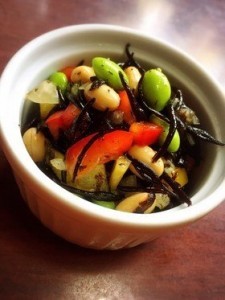 ボールに醤油、酢、甜菜糖、オリーブオイル、わさびを入れて混ぜ、そこにひじき、たまねぎ、パプリカ、枝豆、水気を切った水煮大豆を入れて混ぜ合わせて完成です。