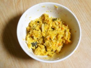 圧力鍋で蒸し煮したかぼちゃを皮ごと潰し、塩揉みした人参とたまねぎ、みじん切りにしたゆで卵と合わせます。