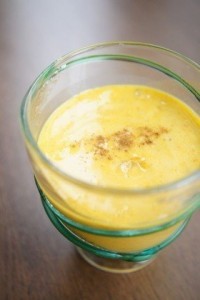 南瓜のワタ、種を取り、皮を剥いて5㎜程度にスライスしたものを電子レンジで加熱し、フォークなどでマッシュしたものと、カットした冷凍バナナ、プレーンヨーグルトをミキサーに入れて攪拌し、コップに注いだらシナモンを振って完成です。